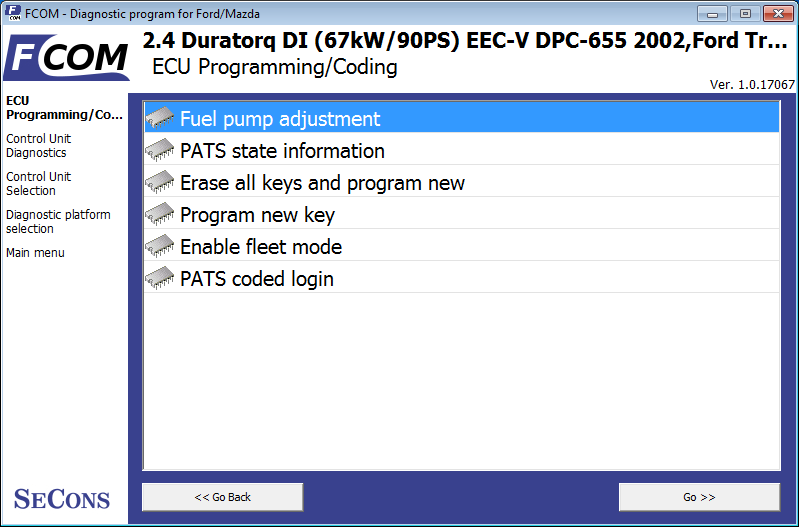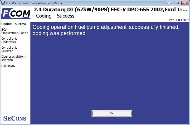 Hvis du ikke kan finde Brændstofpumpejusteringsfunktionen i menuen, så send os venligst en fil med et hurtigt snapshot (gå til menuen Kontrolenhedsidentifikation en klikknap Gem ECU-information), varenummer på ECU (xxxx-12A650-xx) og VIN-koden på adressen [email protected]. En funktion vil blive tilføjet.