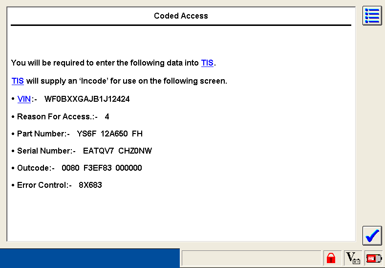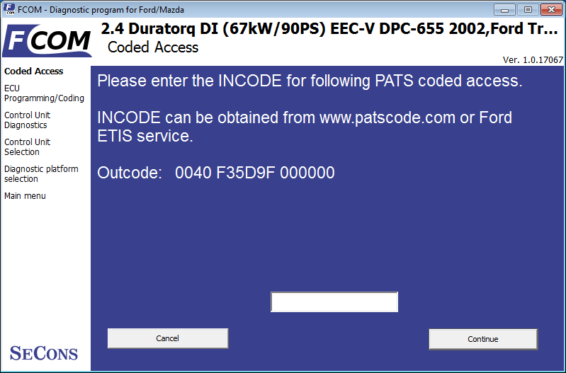 INCODE kan fås på https://www.patscode.com/ eller ved at bruge Ford ETIS-tjenesten.