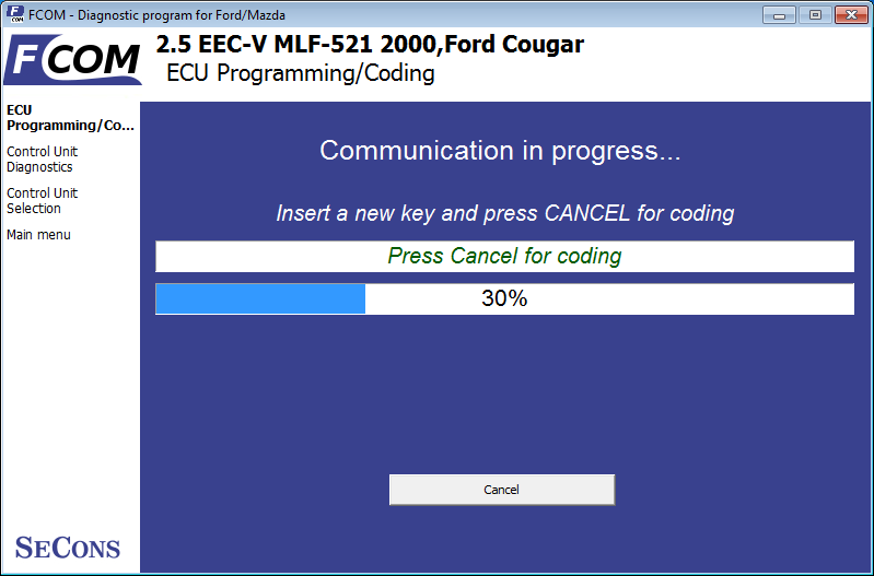 Tryk derefter på //Cancel//-knappen for at starte kodningsproceduren. Hvis du skifter nøgle, må tændingen ikke være slået fra i mere end 10 sekunder.