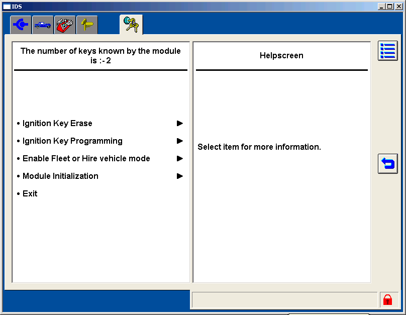 Denne funktion viser alle vigtige oplysninger om PATS-systemet og dets tilstand. Ford IDS leverer ikke denne funktion.