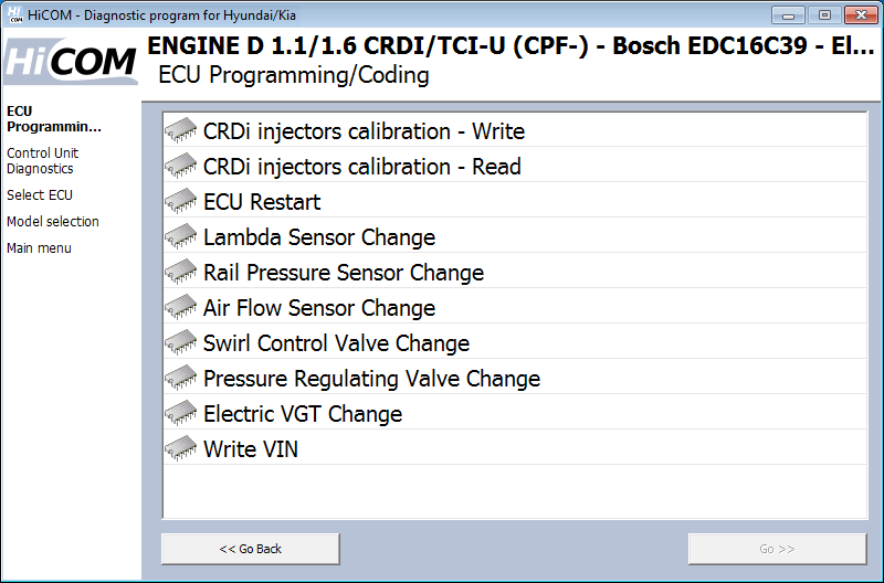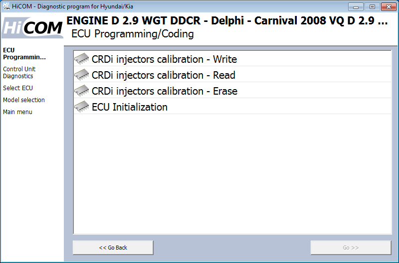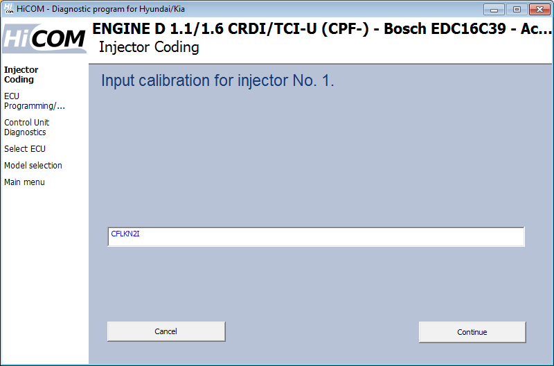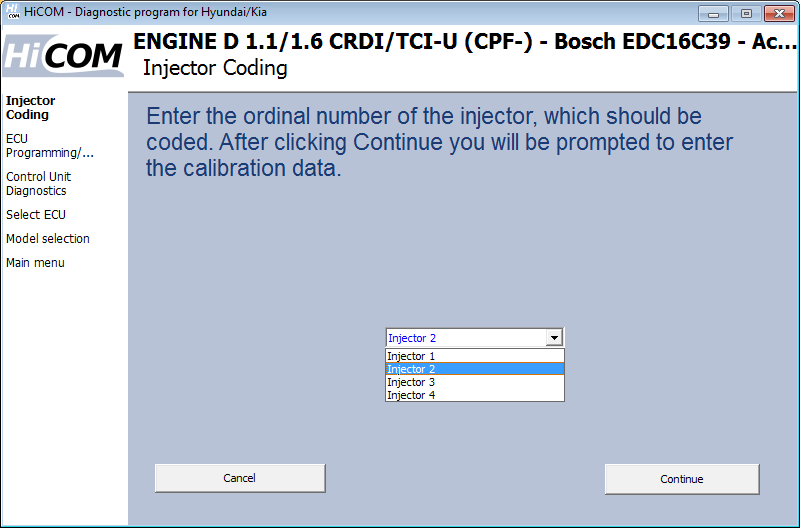 CRDi-injektorkalibrering er tilgængelig i menuen "ECU-programmering/kodning" efter tilslutning til dieselmotorstyreenheden.