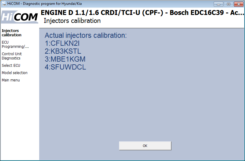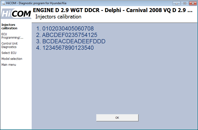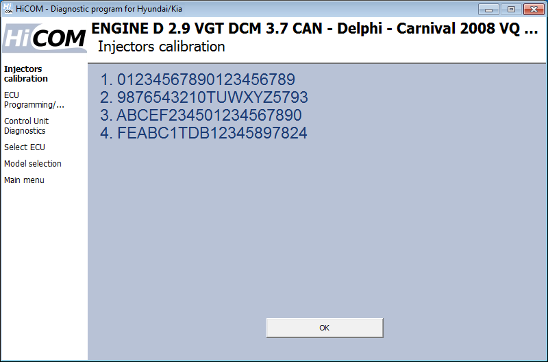 Eksempel på kalibreringsnumre indtastet i Delphi DCM styreenhed på CAN bus. For hver injektor indtastes et 20-cifret kalibreringsnummer, der indeholder bogstaver og cifre.